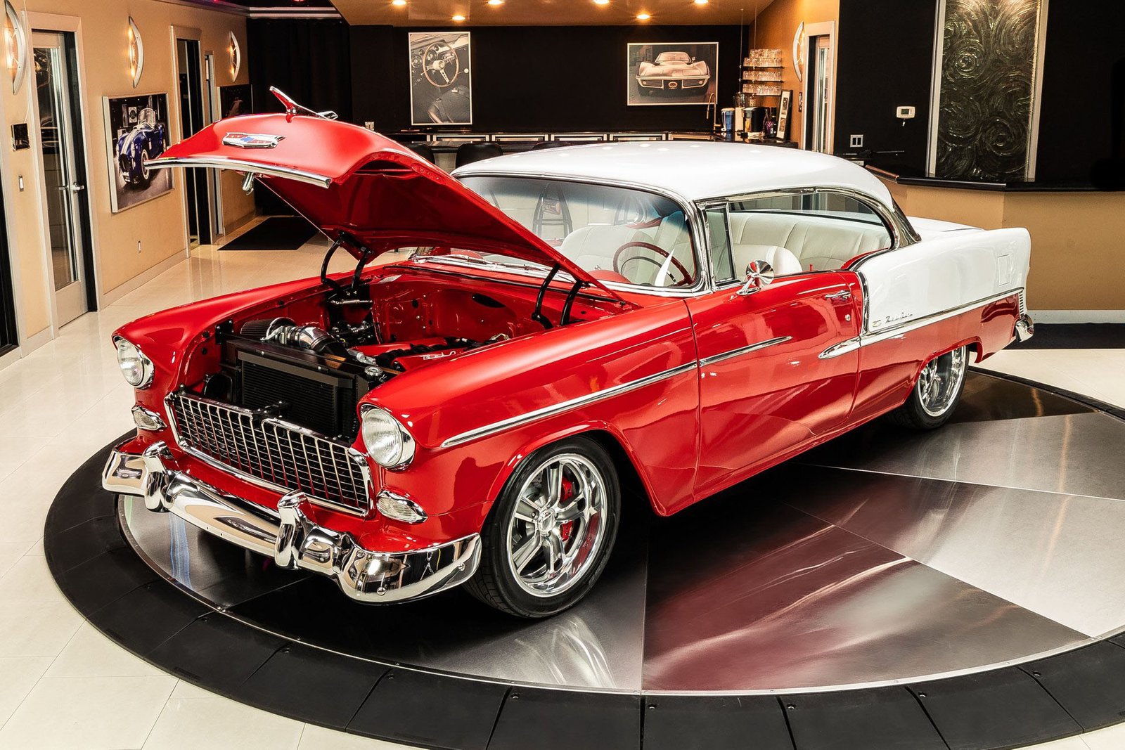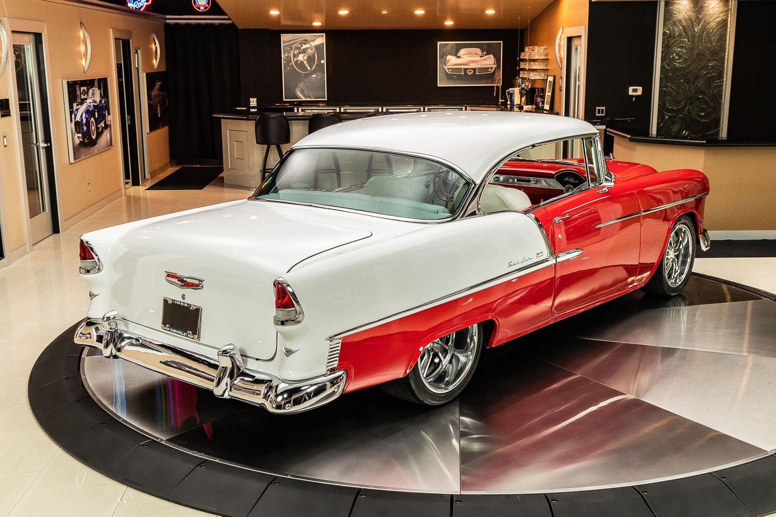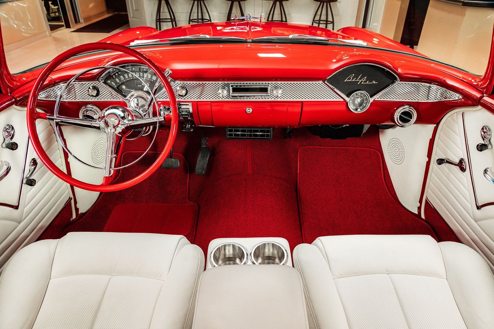 Finished in a striking red and white exterior, the body presents with laser-straight panels and mirror-like paint that highlight the iconic Tri-Five silhouette. Inside, the cabin features custom seating, upgraded interior trim, and thoughtful conveniences that make the car enjoyable for long drives or car show weekends. The fully finished trunk and clean undercarriage further reflect the high level of craftsmanship throughout the build.