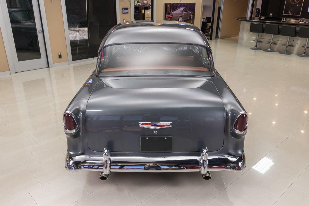This example has benefited from a complete frame-off, nut-and-bolt rotisserie restoration, resulting in a car that presents beautifully from every angle. With very limited mileage since completion, it retains the fresh, tightly assembled feel enthusiasts look for in a high-quality restoration. Finished in a striking graphite gray, the exterior highlights the Bel Air’s crisp lines and polished trim, while the lowered stance gives it a subtle, modern edge without losing its classic identity.