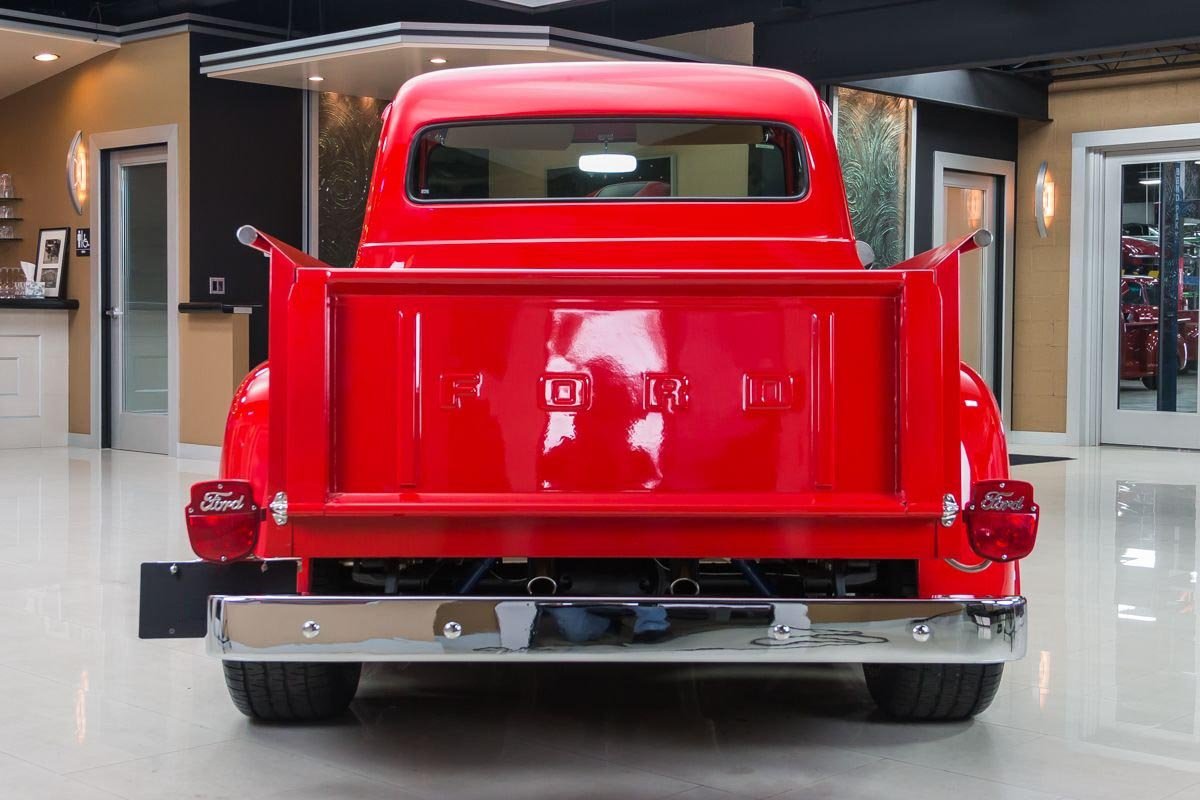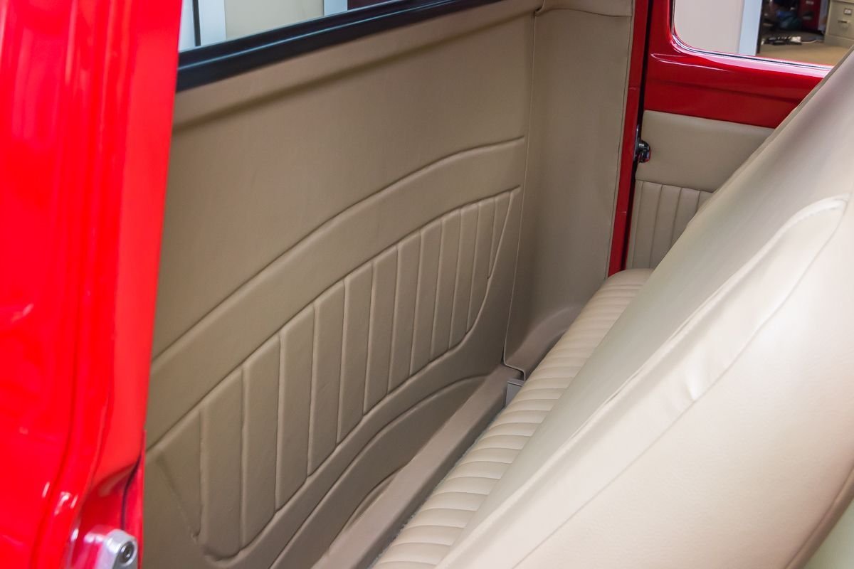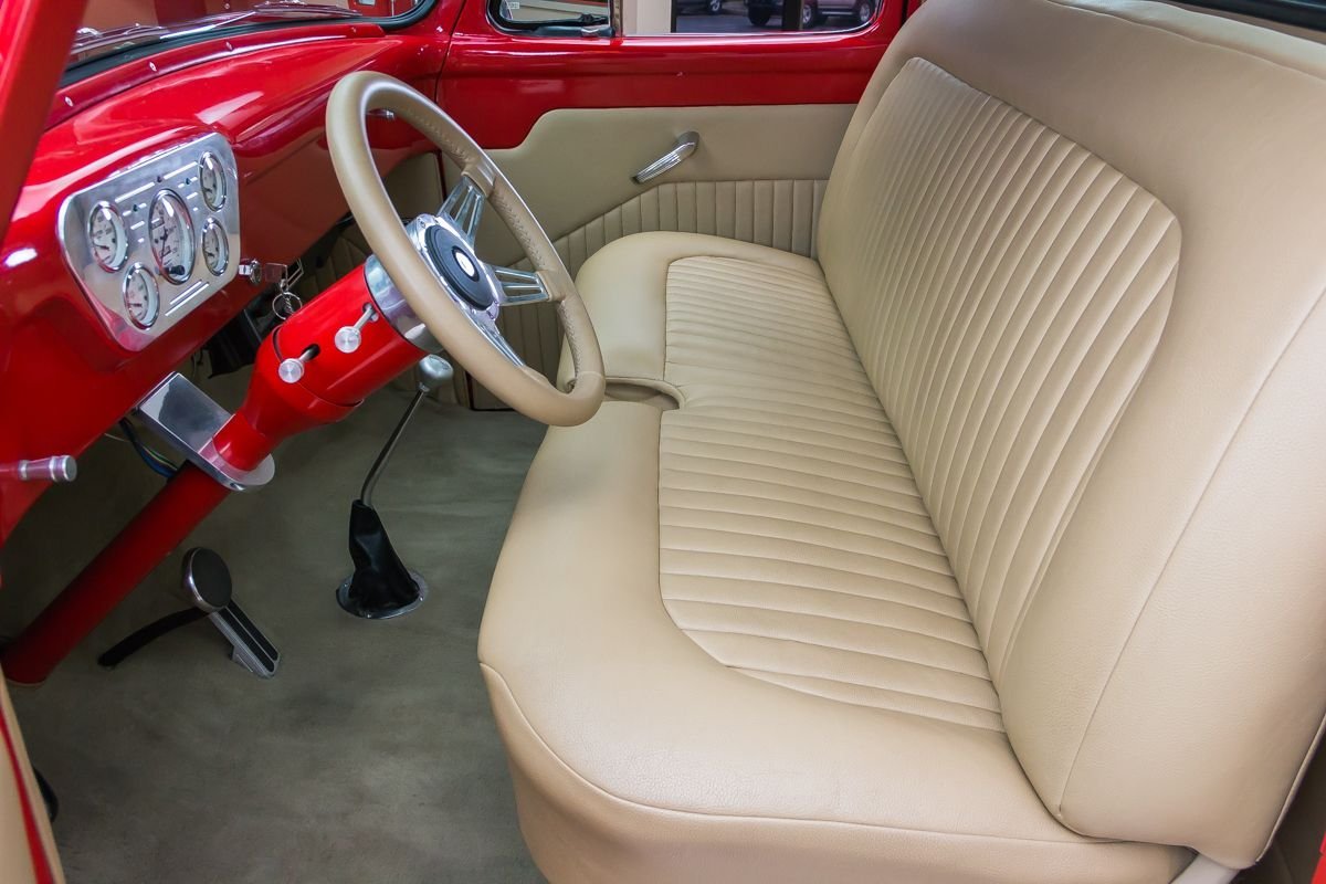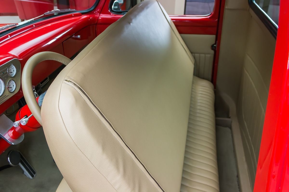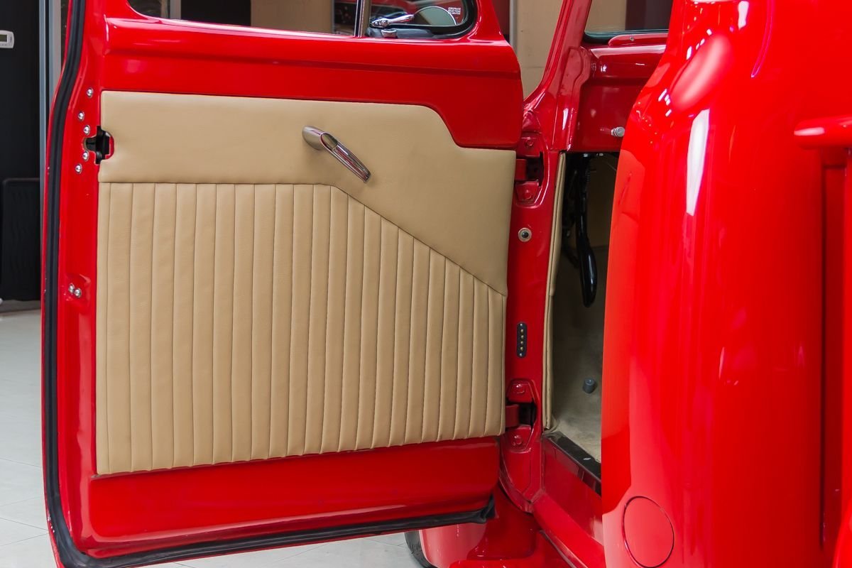 This example has undergone a meticulous frame-off restoration and remains an all-steel truck, a major highlight for collectors and enthusiasts. Finished in red, the body presents exceptionally well with straight panels, excellent gaps, and bright chrome and stainless accents that enhance the truck’s classic appeal. The oak wood bed adds a traditional touch that complements the overall presentation.