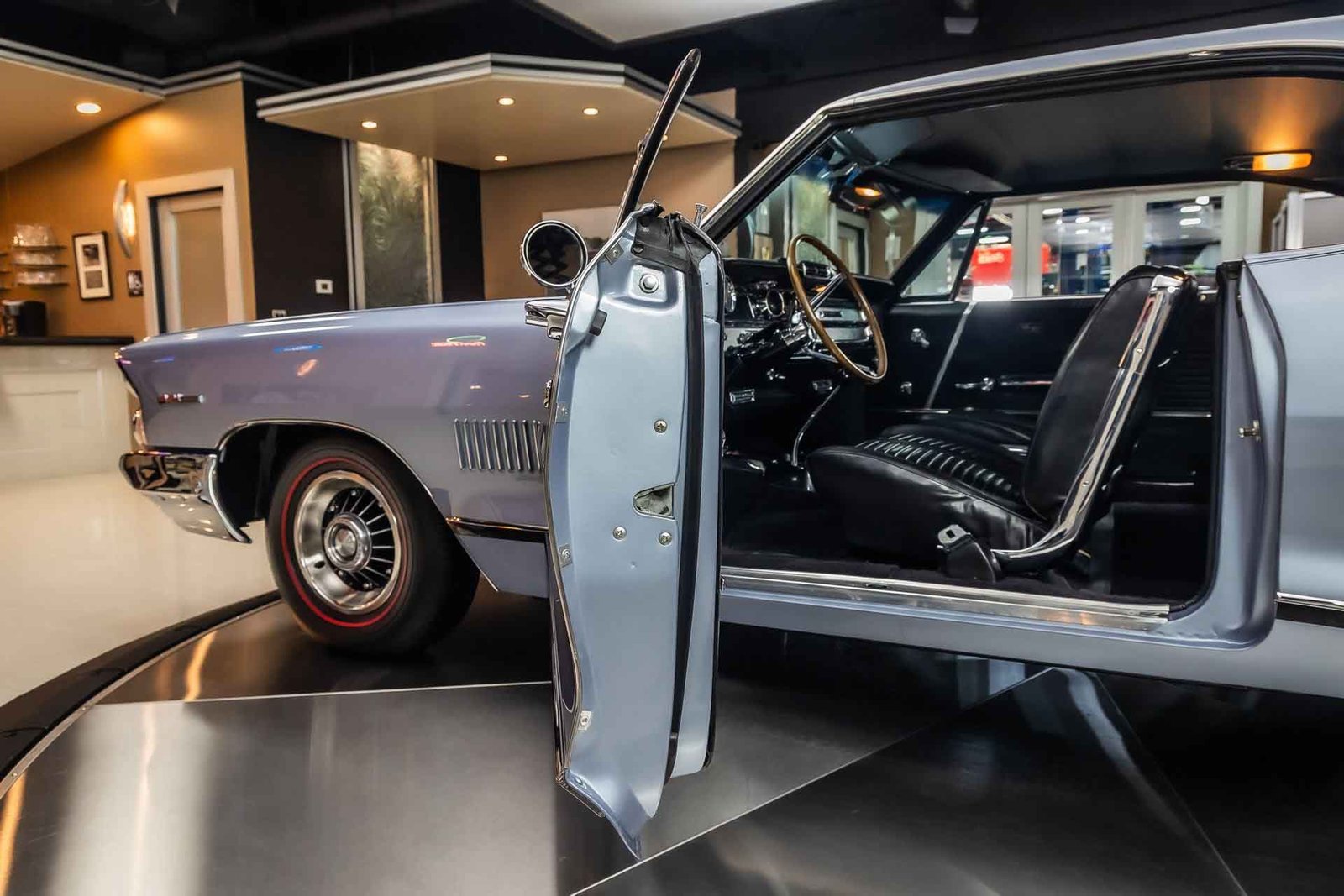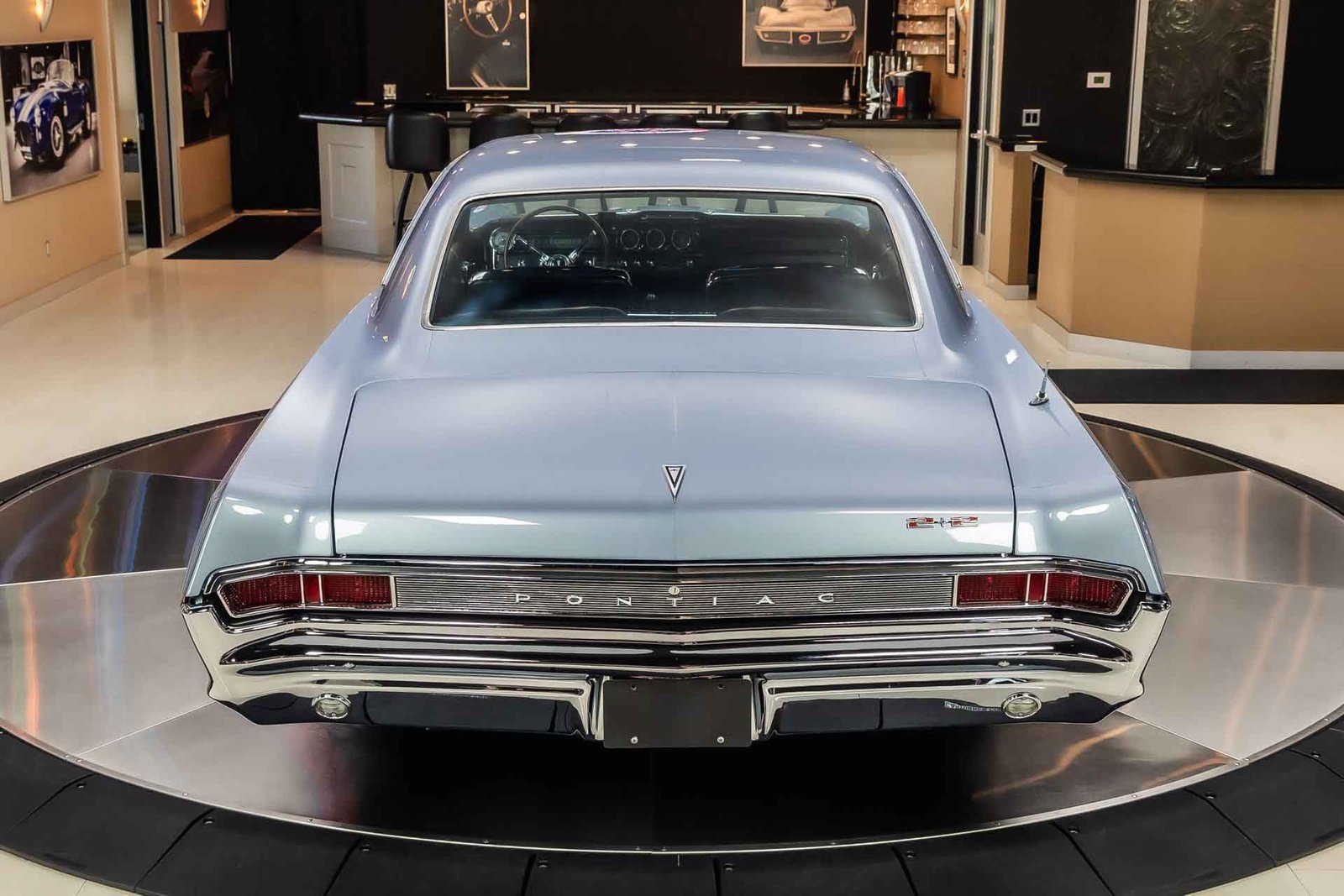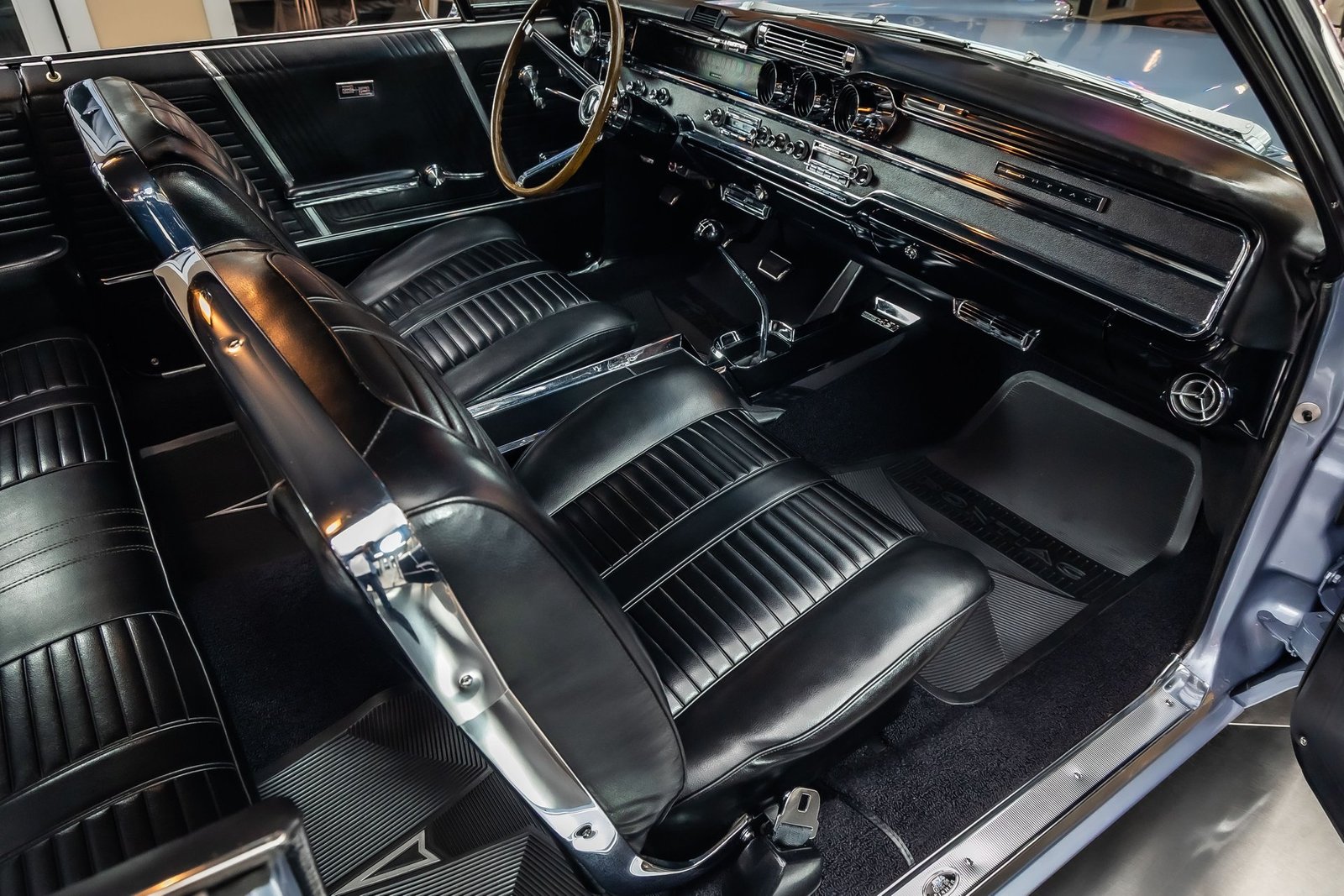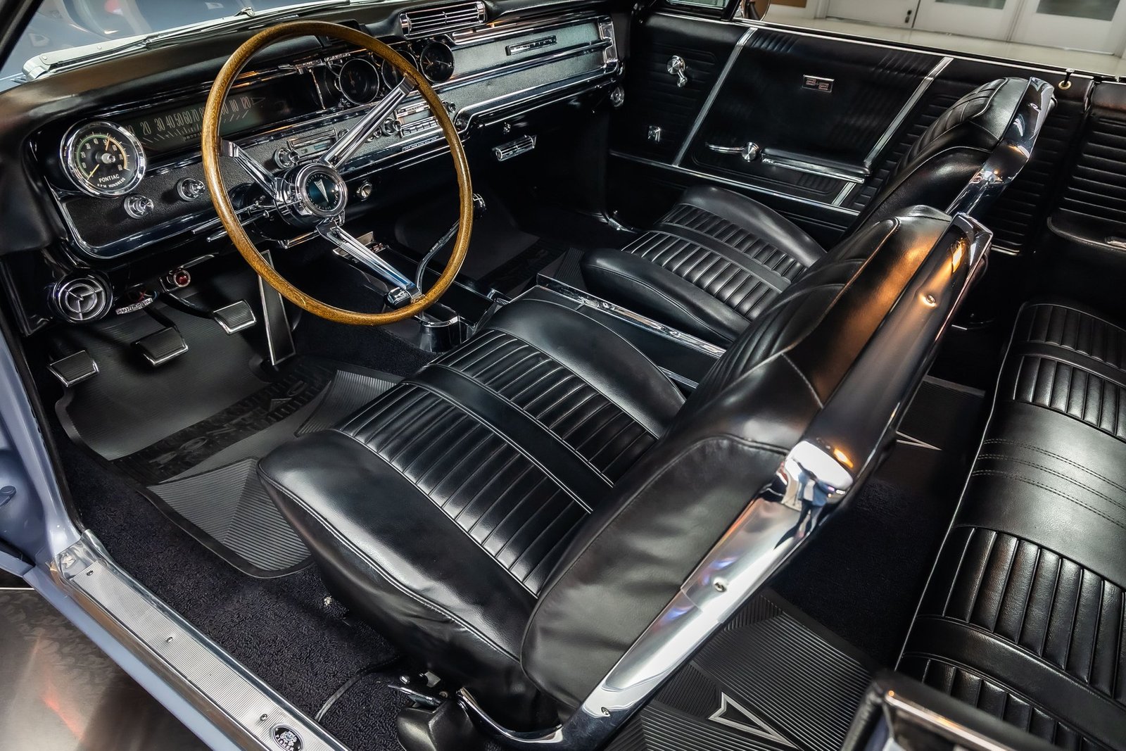 Inside, the black interior provides a sharp contrast to the exterior color and maintains a factory-inspired appearance. Bucket seats, a center console, and period-correct gauges create a driver-focused cockpit, while chrome accents and a classic three-spoke steering wheel add to the upscale muscle car atmosphere Pontiac was known for.