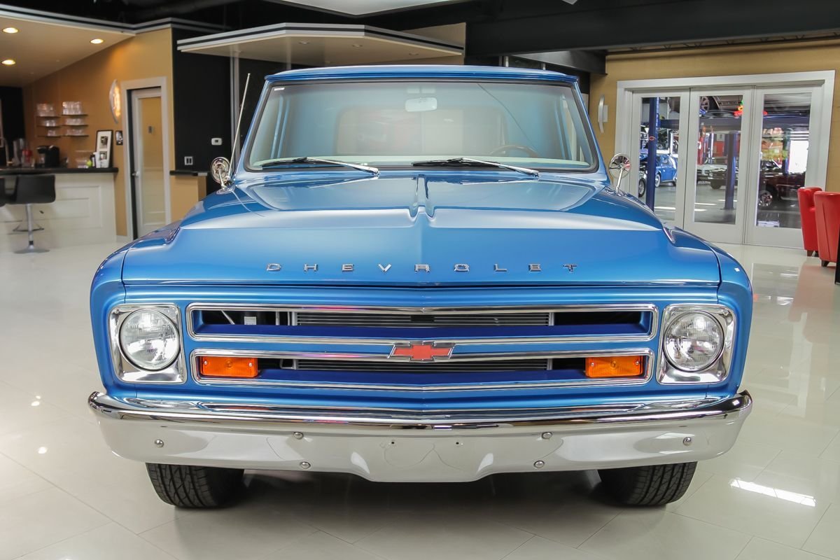 Finished in a medium blue metallic exterior, the truck presents with straight bodywork, excellent trim, and a classic stance. Inside, the white and blue interior closely mirrors the original factory look, featuring restored upholstery, a column shifter, and a clean, detailed dashboard. This C-10 delivers an authentic late-1960s pickup experience, restored to be driven, enjoyed, and proudly shown.