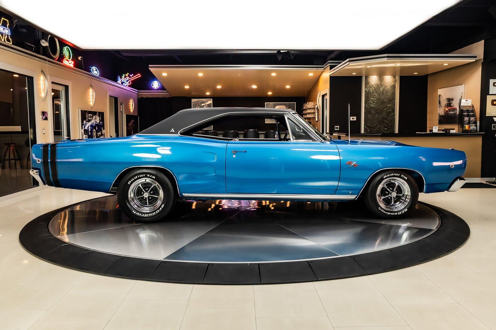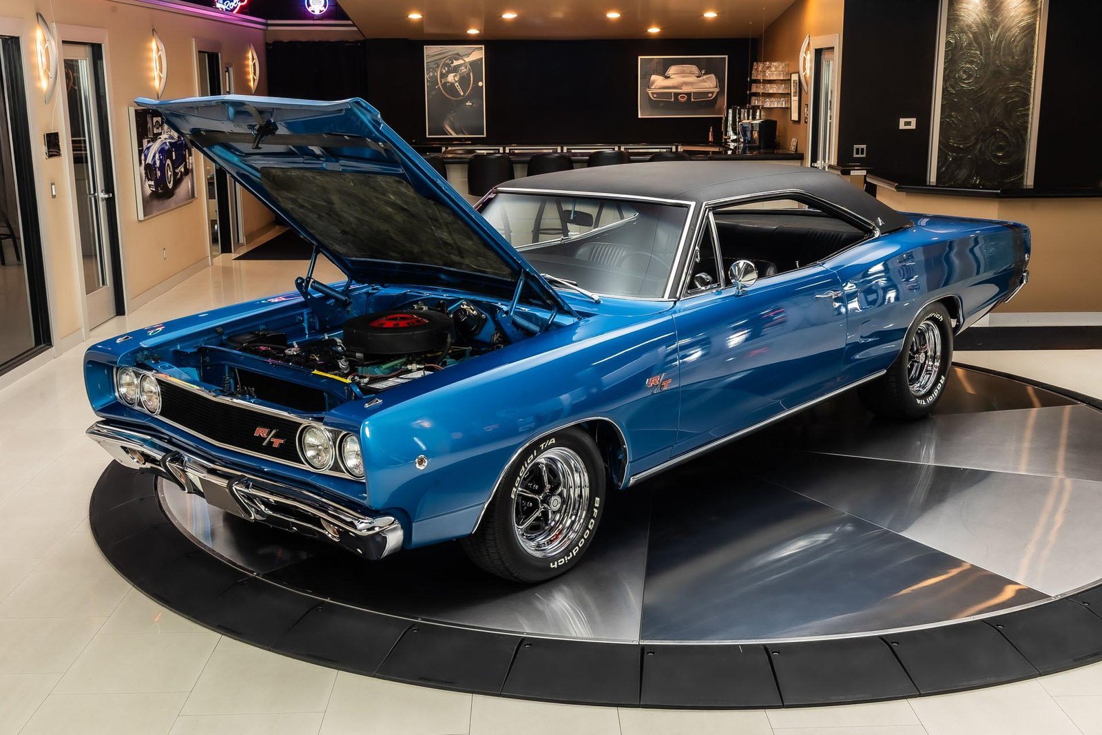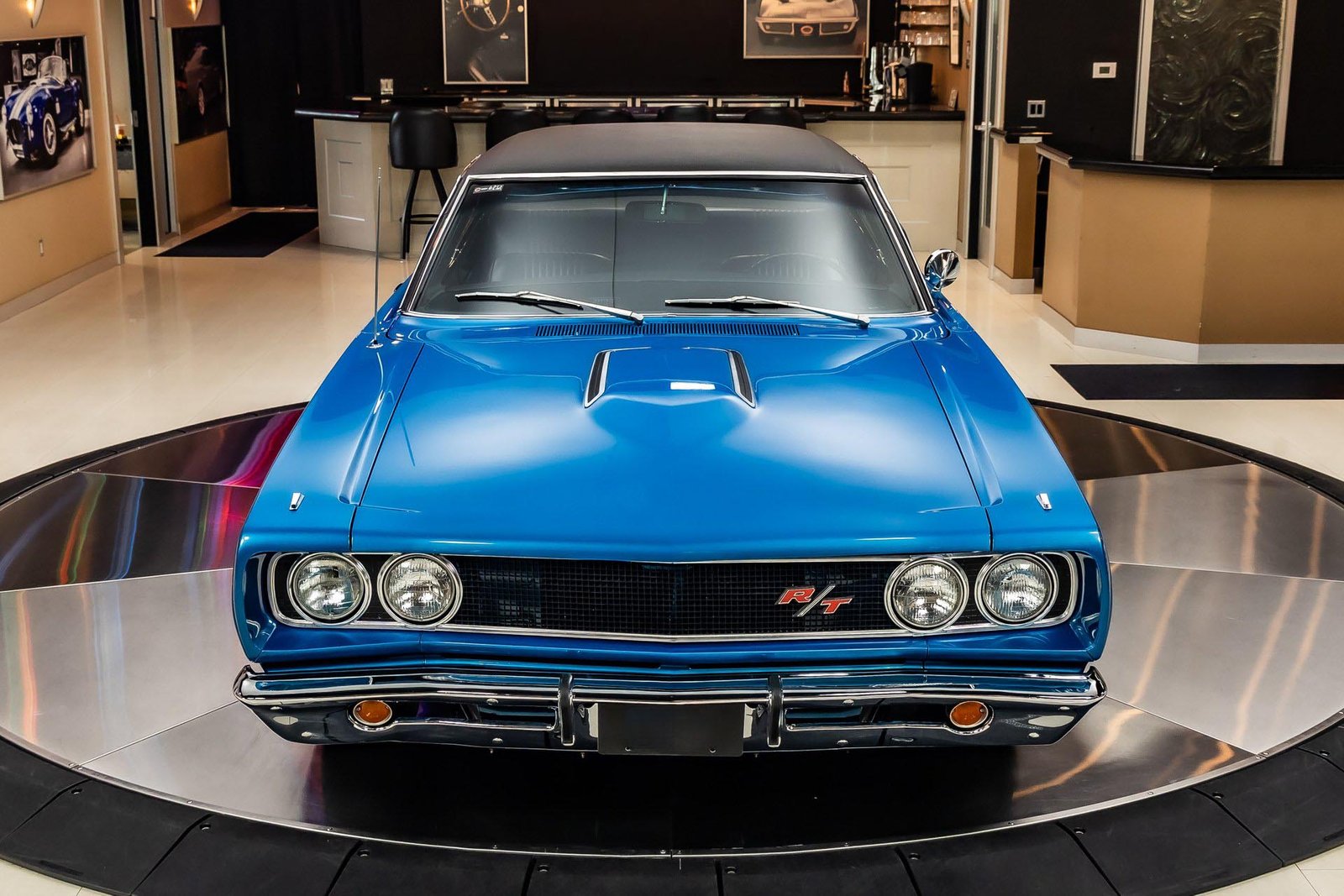 This example has benefited from a meticulous rotisserie restoration and presents beautifully in its factory-correct Bright Metallic Blue. The finish highlights the Coronet’s long, straight body lines and is complemented by a black vinyl top and classic performance details that define the R/T’s unmistakable presence. The overall look is bold, authentic, and unmistakably late-’60s Mopar.