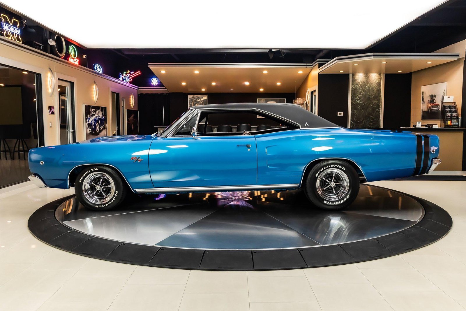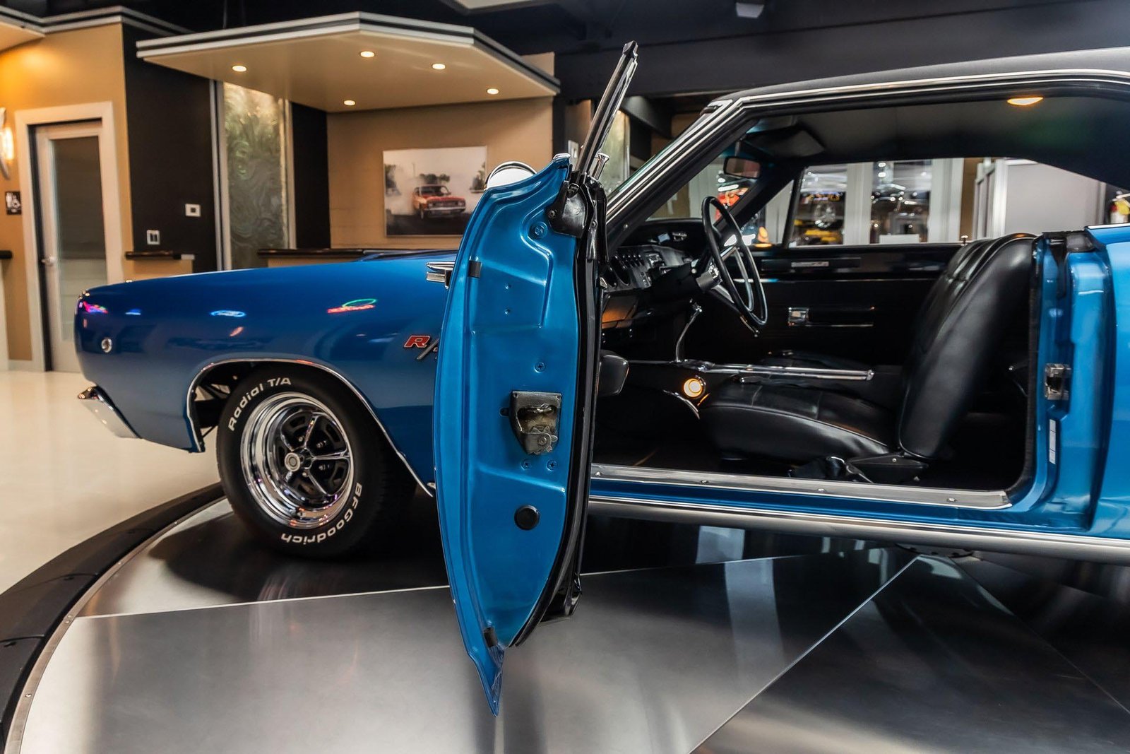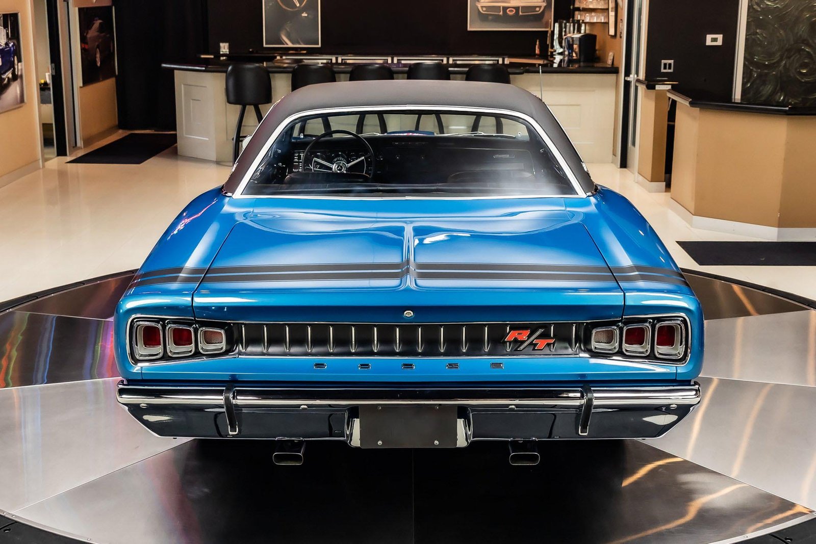 This example has benefited from a meticulous rotisserie restoration and presents beautifully in its factory-correct Bright Metallic Blue. The finish highlights the Coronet’s long, straight body lines and is complemented by a black vinyl top and classic performance details that define the R/T’s unmistakable presence. The overall look is bold, authentic, and unmistakably late-’60s Mopar.
