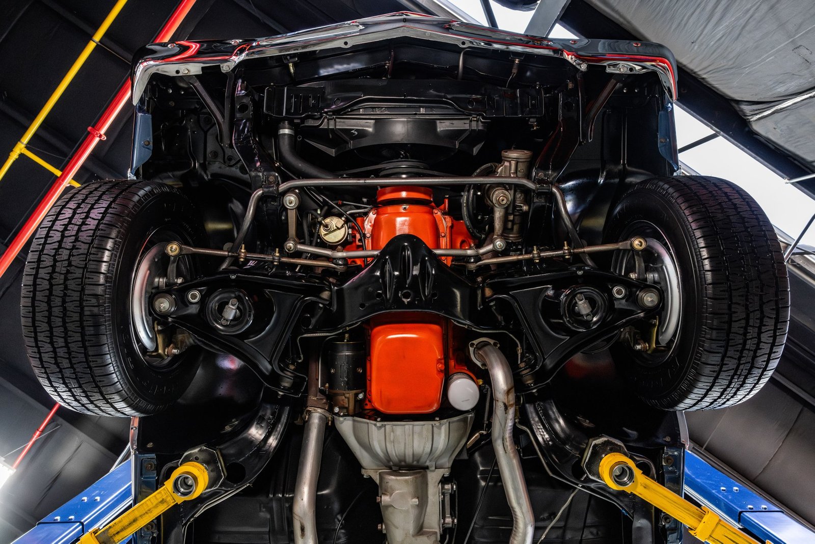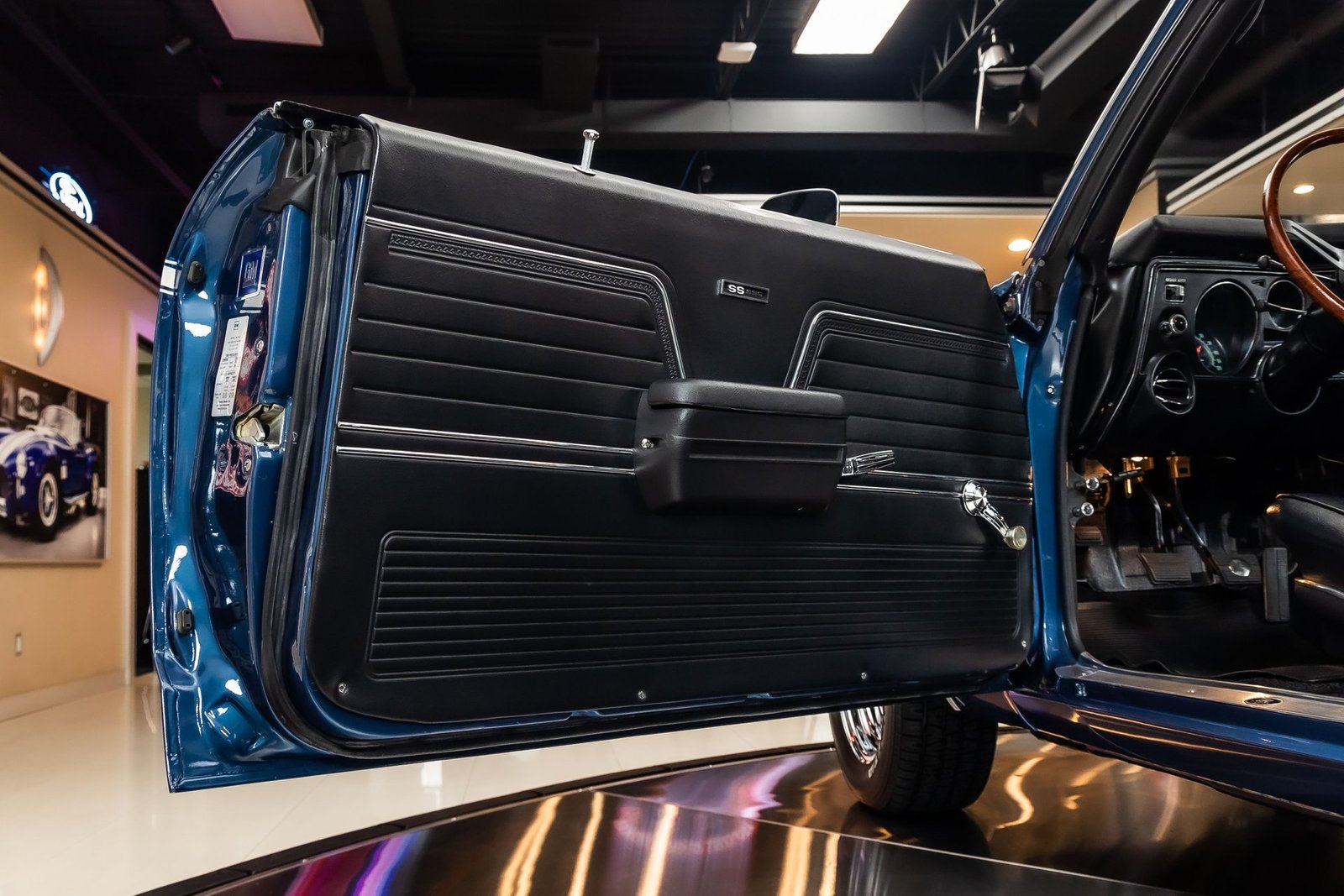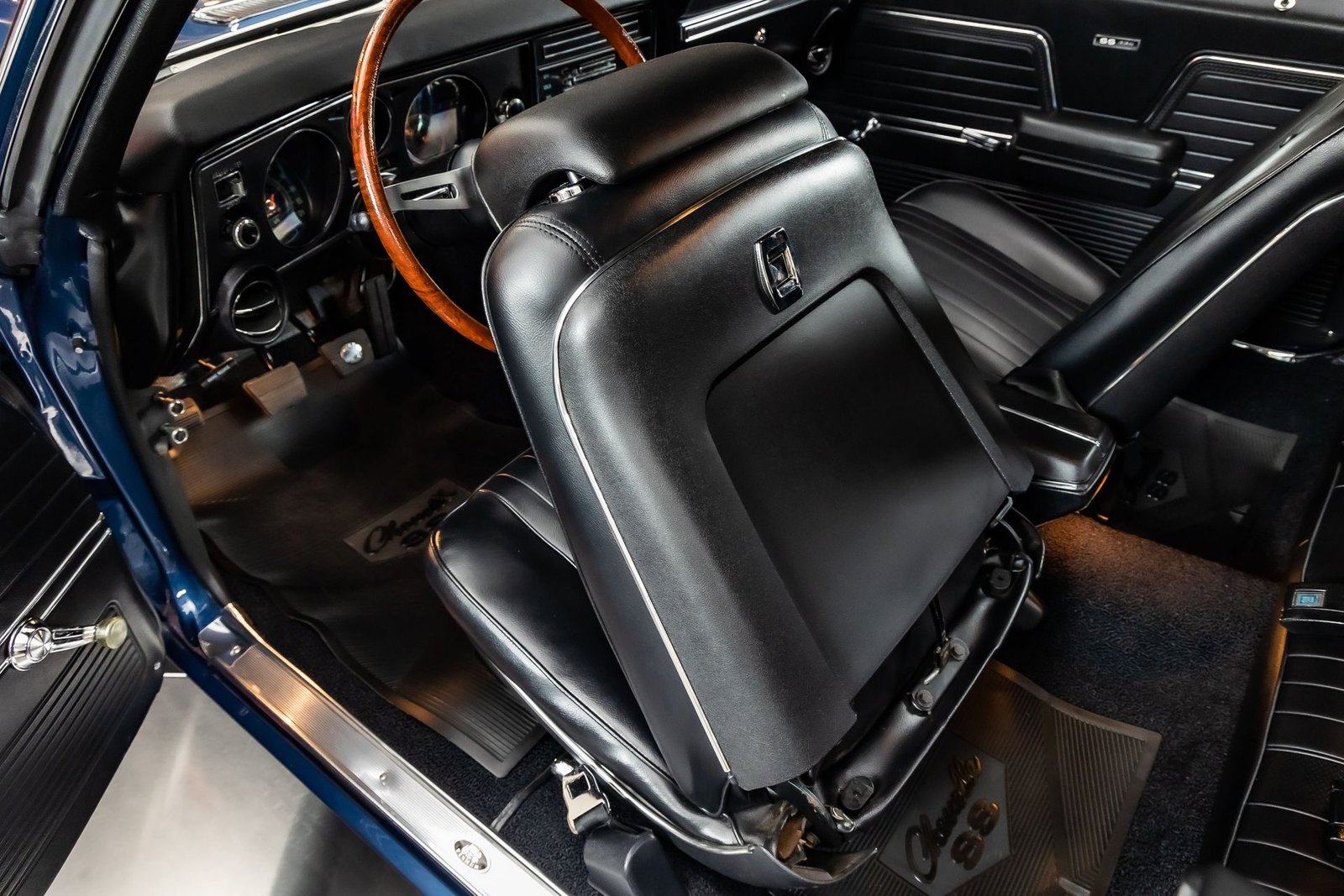 This example is a documented Super Sport that has undergone a complete, no-expense-spared frame-off restoration, resulting in a car that presents at an exceptionally high level. Finished in Dark Blue Metallic with a contrasting white side stripe, the exterior highlights the Chevelle’s muscular proportions while remaining true to its factory-correct appearance. The overall fit and finish reflect the care taken to preserve originality throughout the build.