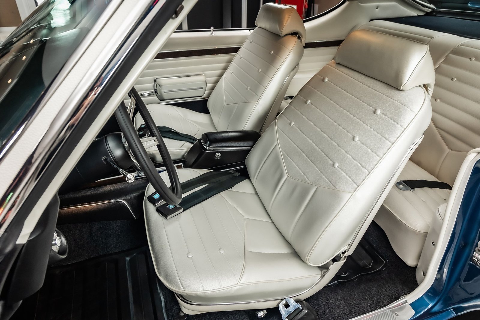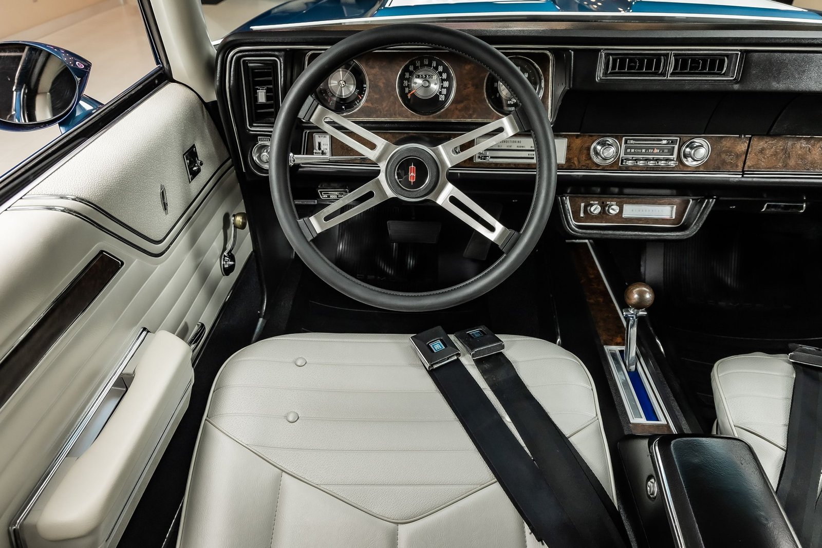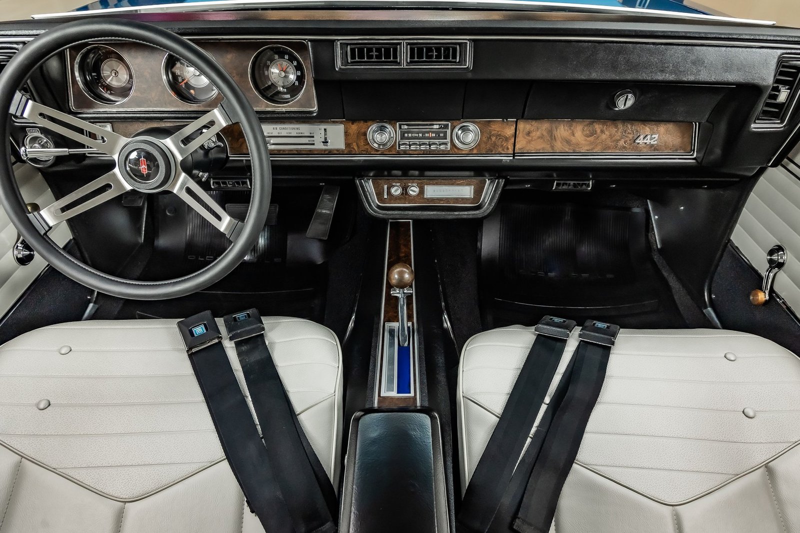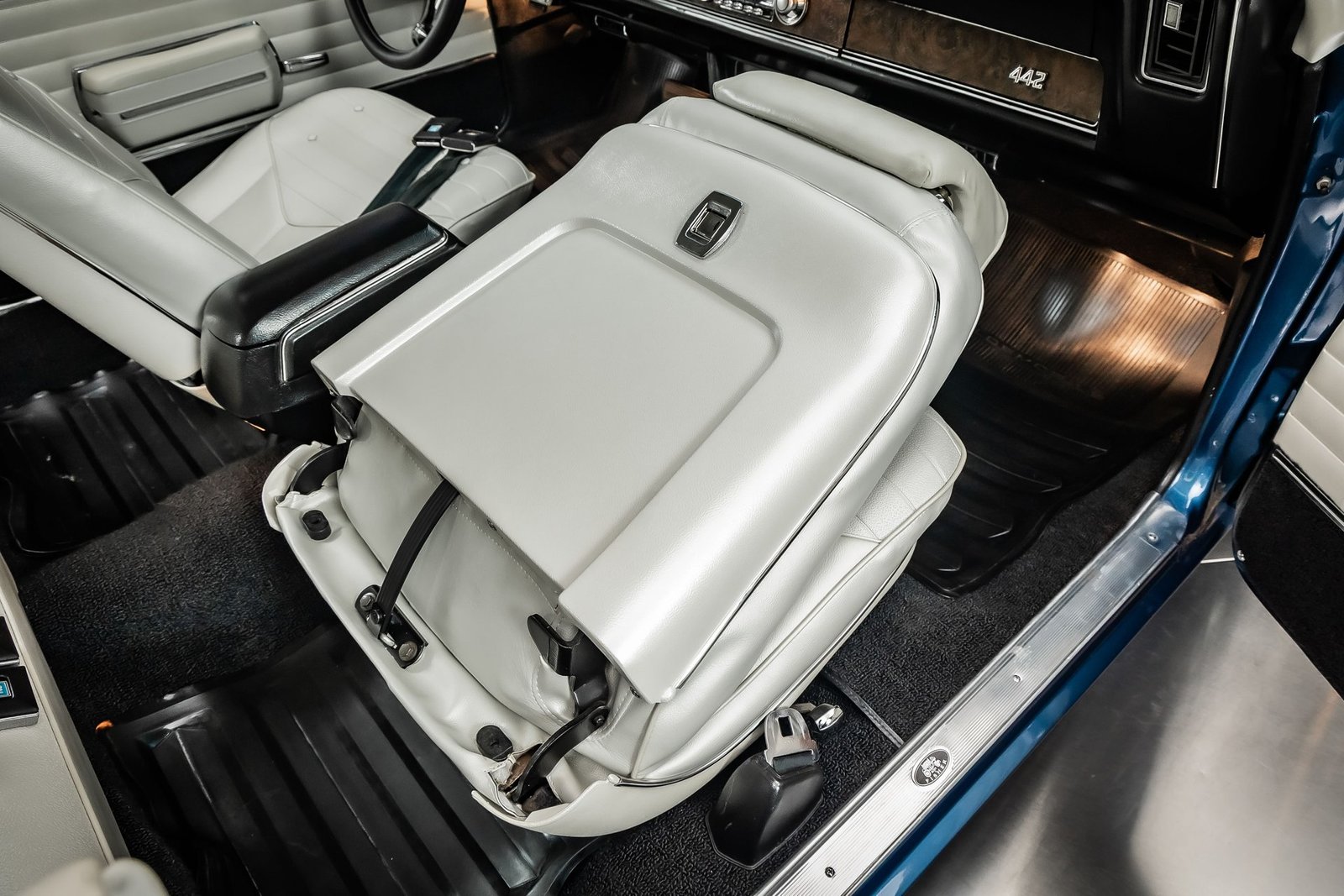 Finished in a striking blue exterior accented by white stripes and a white top, this 442 has a commanding presence that immediately captures attention. The classic color combination complements the car’s muscular body lines, while the frame-off restoration is evident in the crisp presentation and overall fit and finish. This is the kind of car that looks just as impressive rolling into a show as it does sitting still.