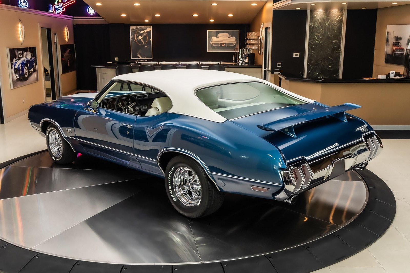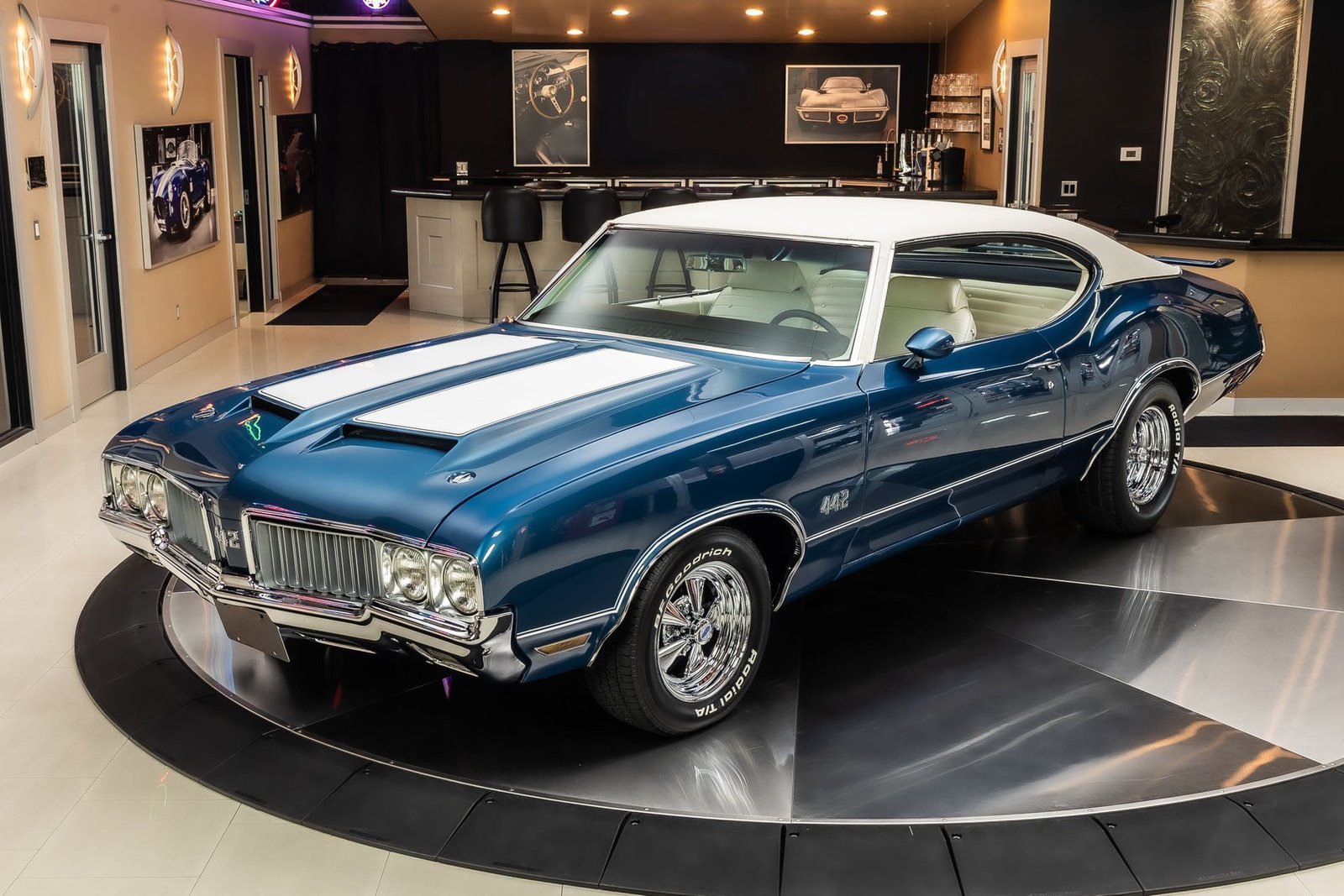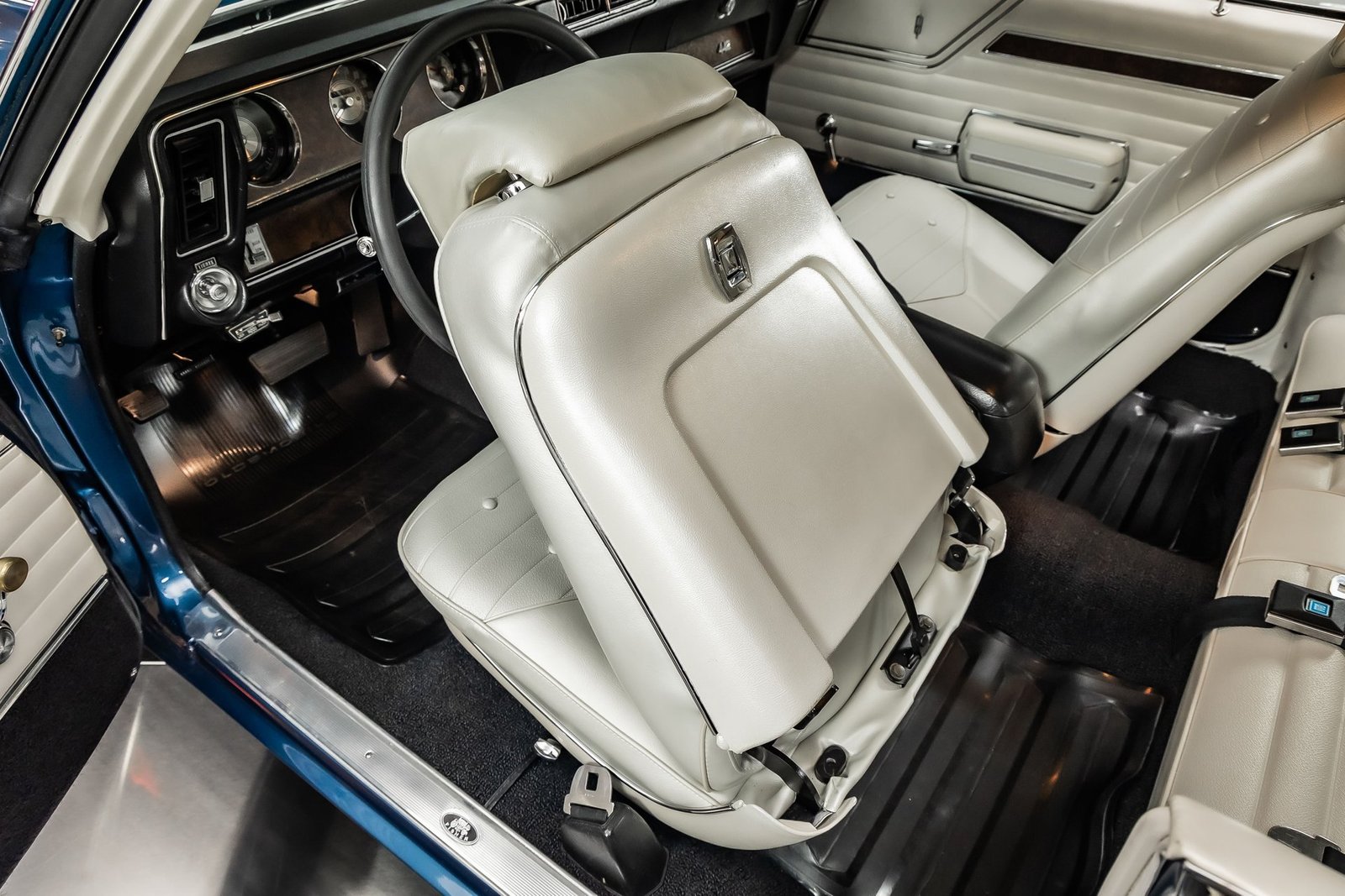 Finished in a striking blue exterior accented by white stripes and a white top, this 442 has a commanding presence that immediately captures attention. The classic color combination complements the car’s muscular body lines, while the frame-off restoration is evident in the crisp presentation and overall fit and finish. This is the kind of car that looks just as impressive rolling into a show as it does sitting still.