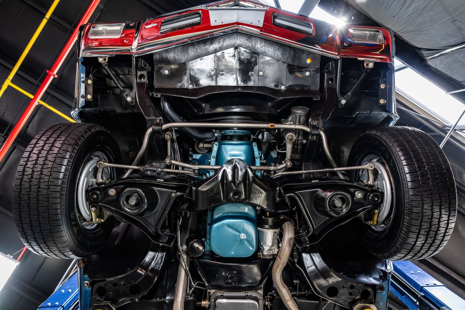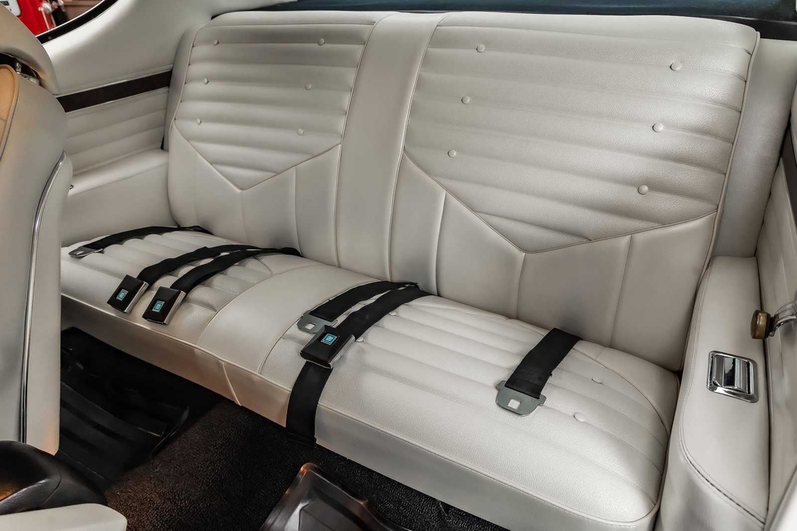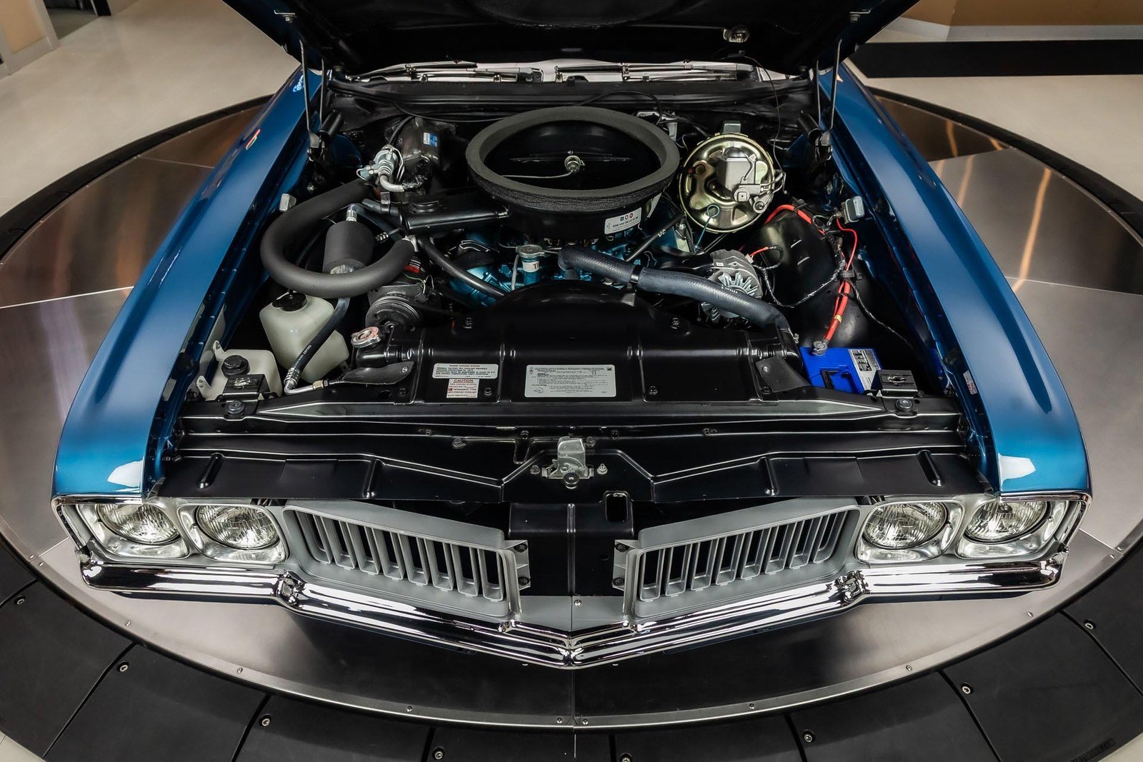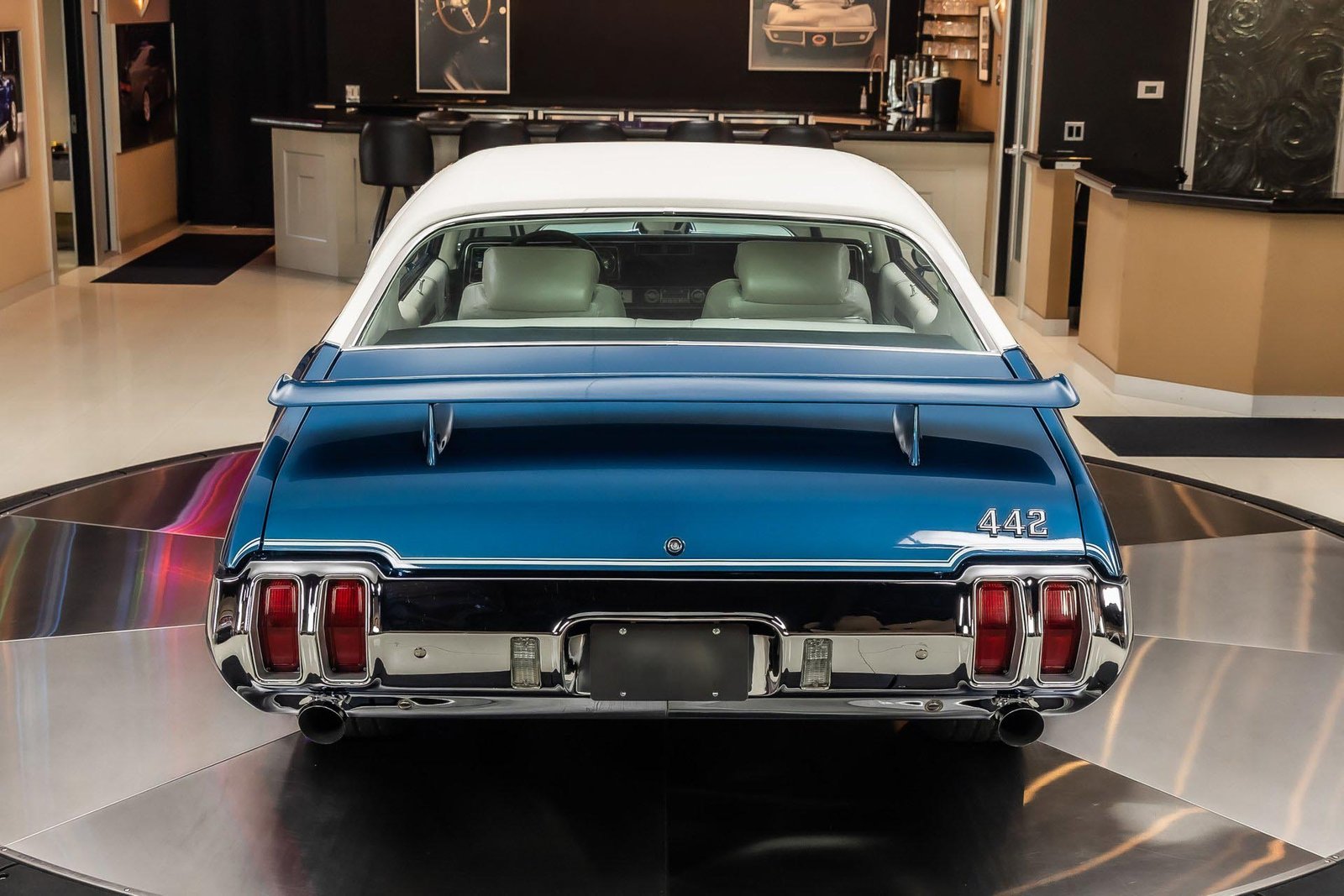 Finished in a striking blue exterior accented by white stripes and a white top, this 442 has a commanding presence that immediately captures attention. The classic color combination complements the car’s muscular body lines, while the frame-off restoration is evident in the crisp presentation and overall fit and finish. This is the kind of car that looks just as impressive rolling into a show as it does sitting still.